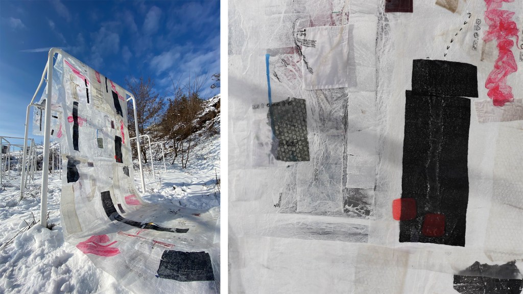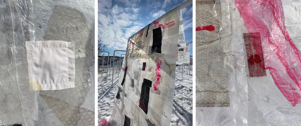 Waste materials of plastic and textile are combined with a production process of modified domestic acts, which are traditionally understood as subordinate to the masculine interests. Artists rely on the often undervalued “women’s work” of homemaking -such as ironing, cleaning and sewing- to produce the “fabric” of the installation from similarly undervalued materials. The site is chosen as a seemingly abandoned part of the university campus filled with mostly unused metal box frames. The piece of “fabric” is laid over one of these frames as an embrace; an act of solidarity between the abandoned and the feminine.